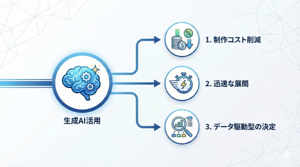 広告業務に生成AIを取り入れることで、企業は大きな競争力を得ることができます。ここでは主な3つのメリットを挙げます。