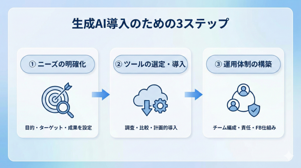 自社で生成AIを導入し、広告運用を成功させるためには、段階的なアプローチが必要です。