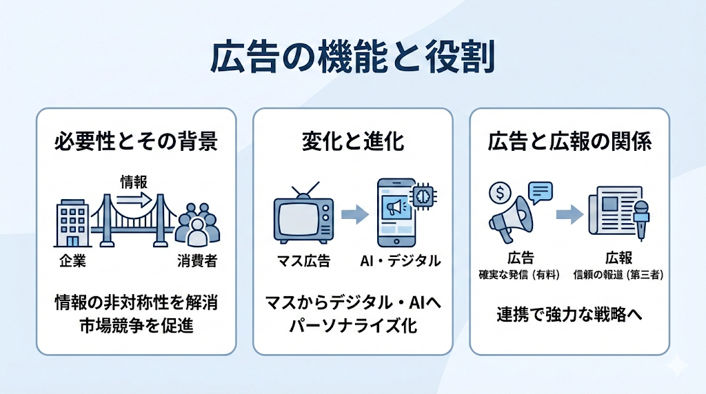 広告は経済活動において不可欠なインフラとしての機能も持っています。ここでは、なぜ広告が必要とされるのか、その背景や進化の過程、そして広報活動との違いについて深掘りします。