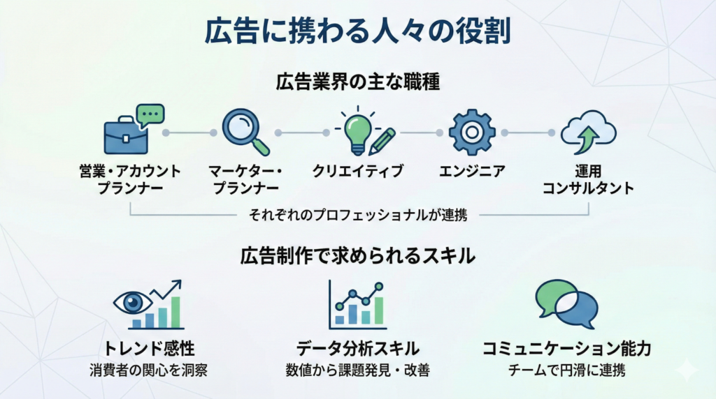 広告は多くの専門家の手によって作られています。広告業界で働く人々がどのような役割を担い、どのようなスキルが求められるのかを紹介します。