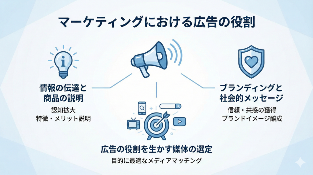 マーケティング活動全体の中で、広告はどのような機能を果たしているのでしょうか。ここでは、広告が担う具体的な3つの役割について詳しく解説します。