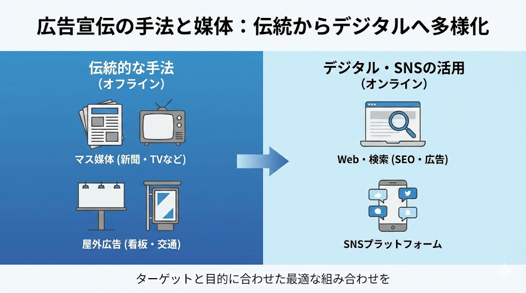 時代と共に、広告宣伝の手法は多様化しています。伝統的な手法からデジタルを活用した最新手法までを整理します。