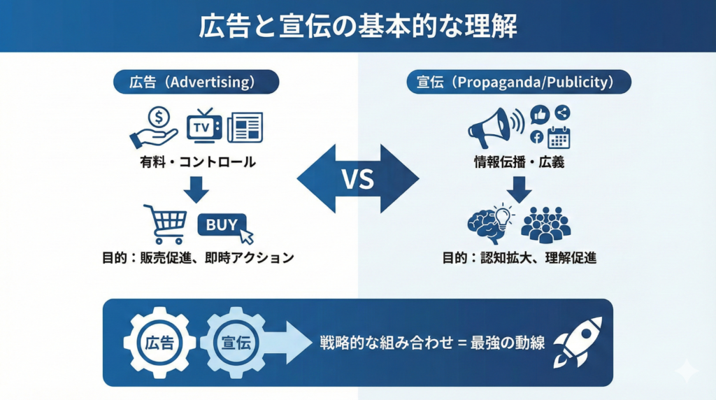 両者の違いを端的に言えば、広告は「枠を買って伝える」ものであり、宣伝は「情報を広める」活動です。