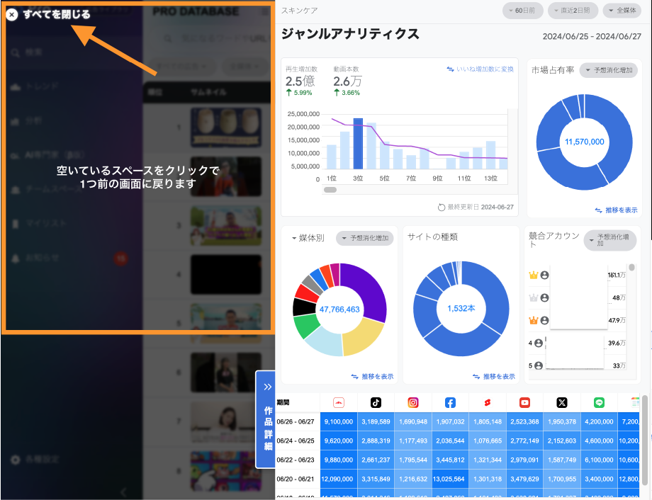 左側の空いているスペースをクリックで、ひとつ前の画面に戻ります ※[すべて閉じる]をクリックすると全画面が閉じます。