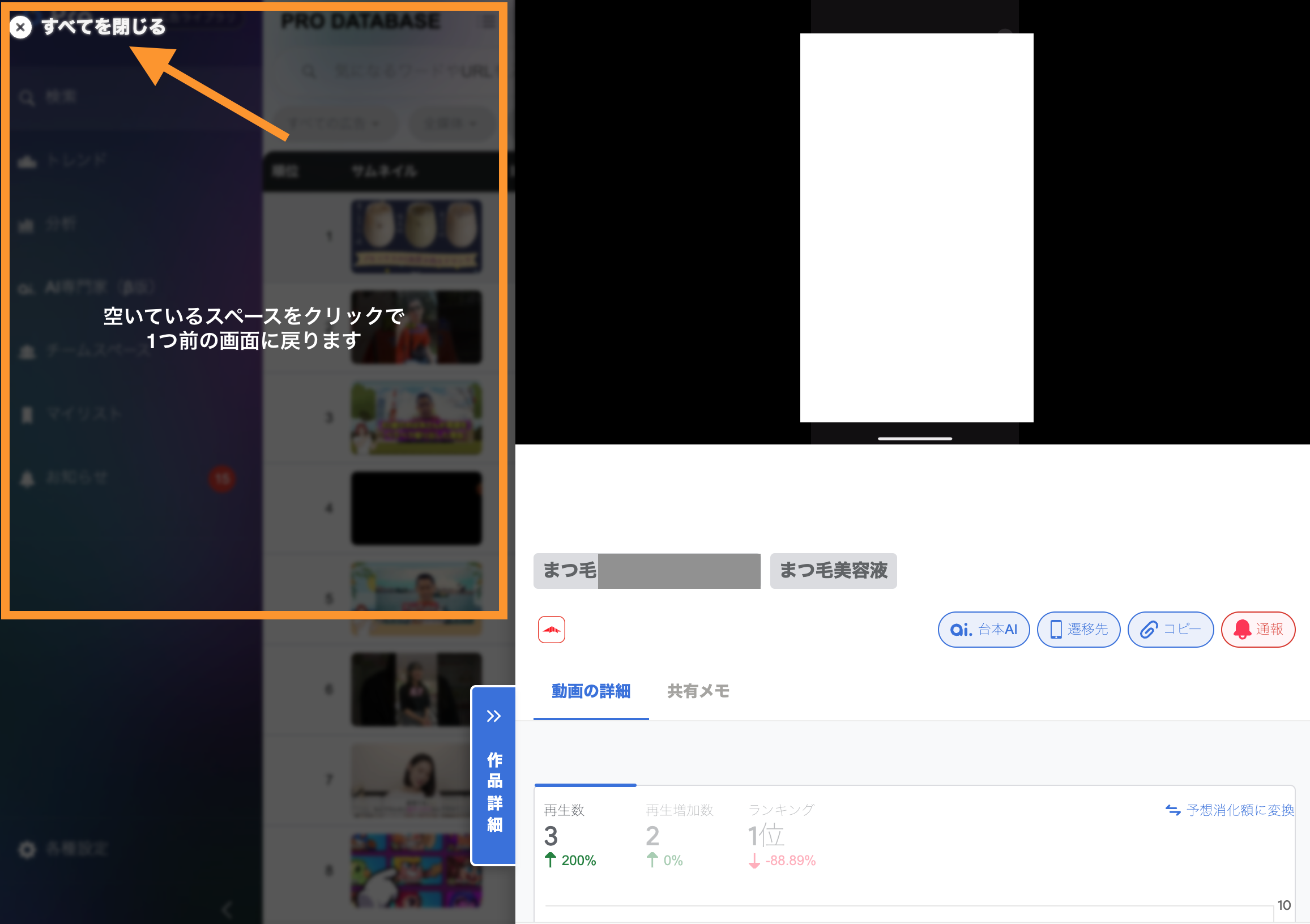 「左側の空いているスペースをクリック」すると、②の[ジャンルアナリティクス]の画面に戻ることができます。※[すべて閉じる]をクリックすると、全画面が閉じます。