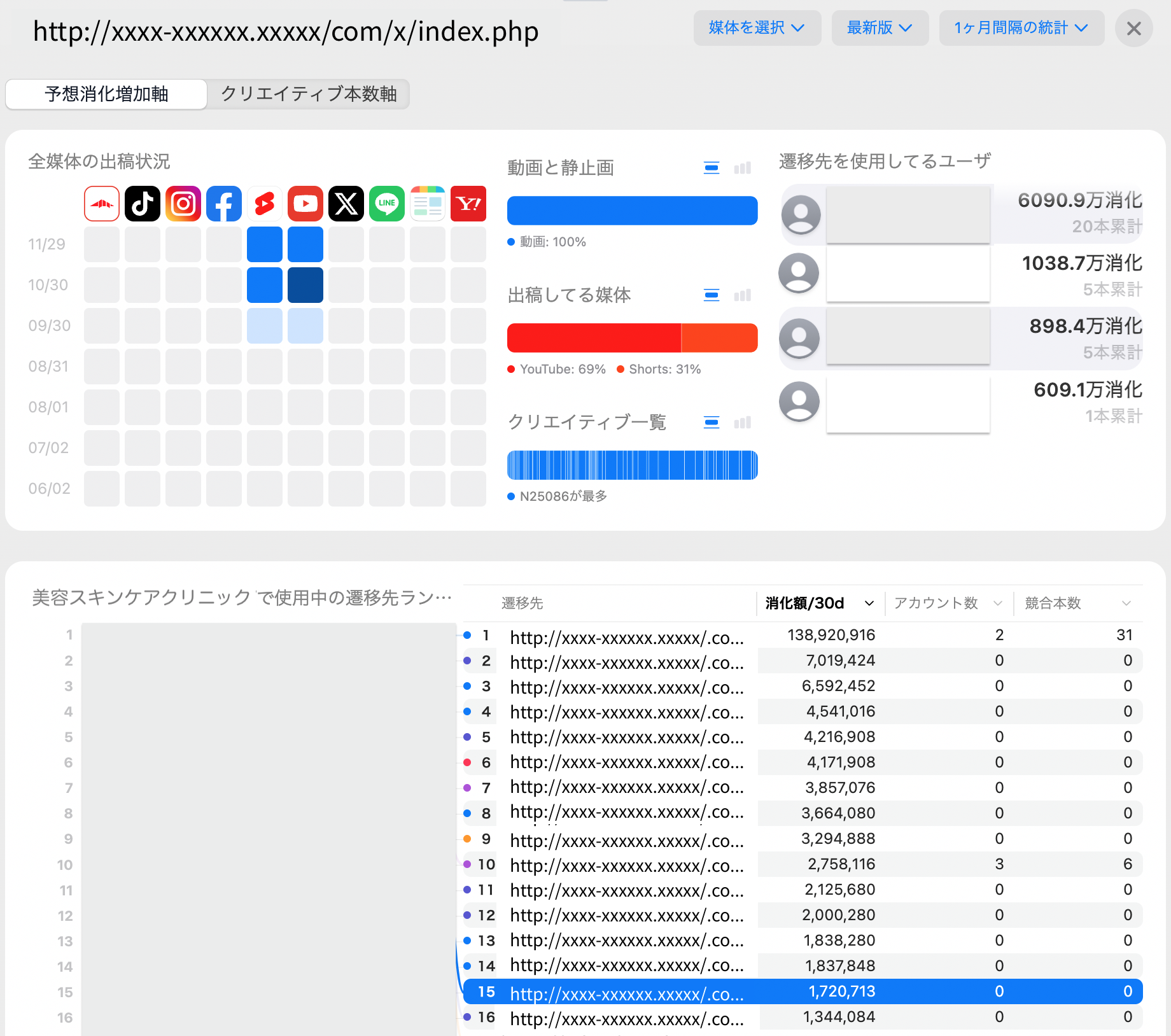 同様のLPを使用している広告アカウントはいくつあるのか、同じLPでもクリエイティブの違いによって予想消化予算額にどのような違いが出ているかなどが可視化されている機能です。ヒットしているLPやトレンドをいち早くキャッチアップし、広告戦略の立案にお役立ていただけます。